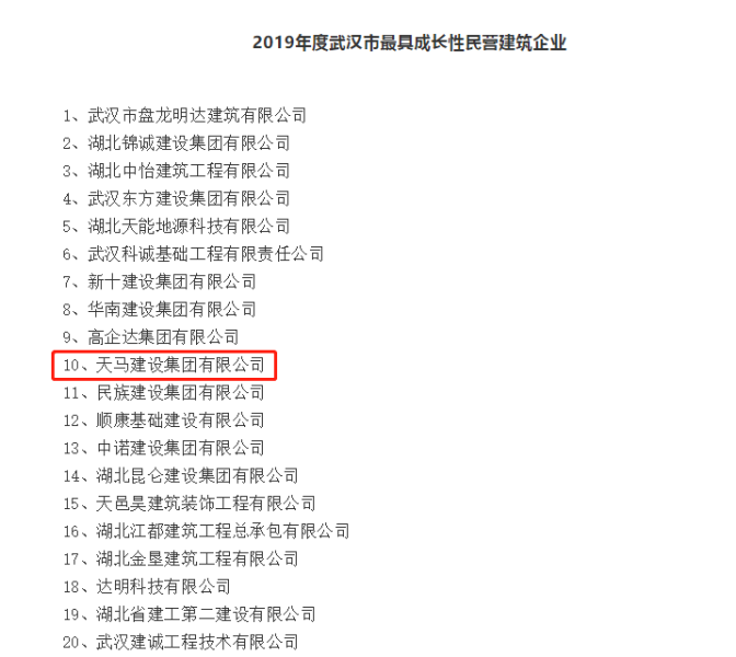 天馬建設(shè)榮膺武漢市最具成長(zhǎng)性民營(yíng)建筑企業(yè)