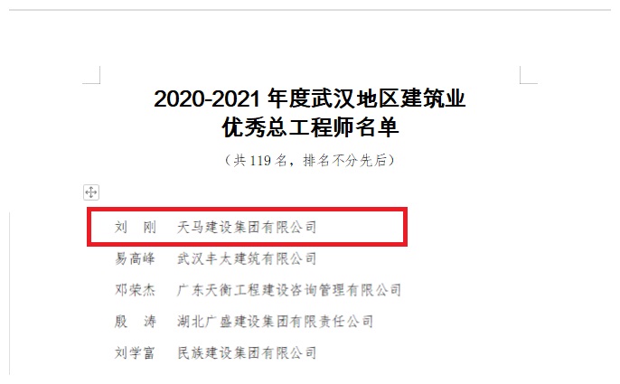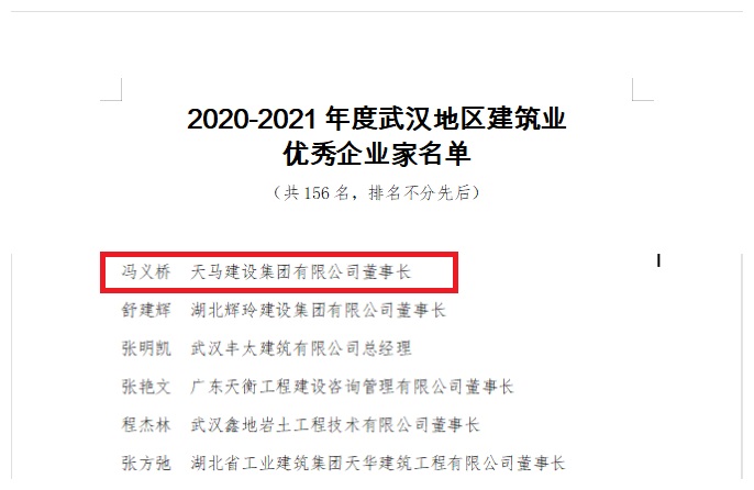 同期,協(xié)會還發(fā)布了建筑“四優(yōu)”等多項榮譽,公司榮獲武漢地區(qū)建筑業(yè)優(yōu)秀企業(yè);董事長馮義橋獲評“優(yōu)秀企業(yè)家”、總工程師劉剛獲評“優(yōu)秀總工程師”;項目經(jīng)理張勇、黃偉、吳義軍等9人獲評“優(yōu)秀項目經(jīng)理”。