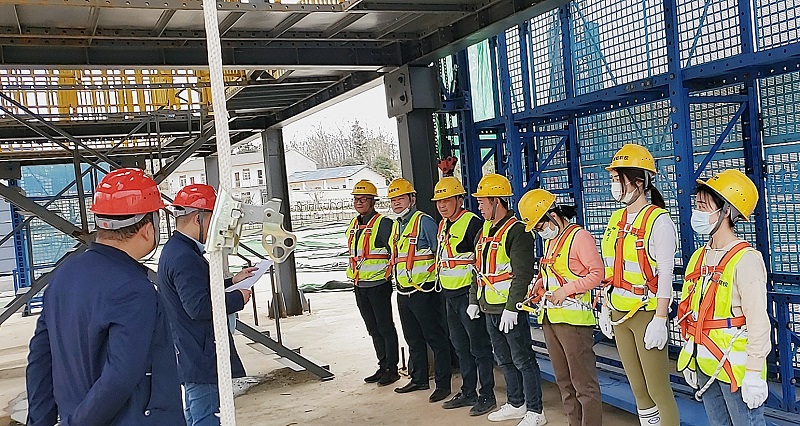 組員之間配合時也要相互溝通,不然因螺栓松動,導致架體脫落,也很容易意外受傷,因此正確佩戴安全帽非常重要。架體安裝完畢后,開始試運行,每兩人一組分別管理一個樓層,收起密封走道板并將其固定好,觀察自己所在層防墜裝置、電動葫蘆及鏈條有沒有異常情況。