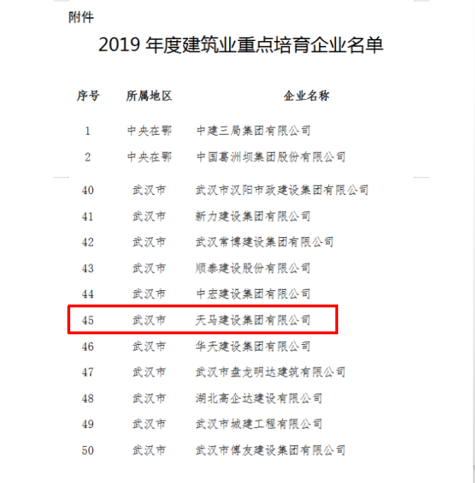 【特別報道】天馬建設(shè)榮登2019年度建筑業(yè)重點培育企業(yè)名單